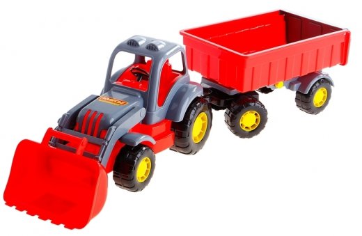 Трактор с прицепом №1 и ковшом Силач – это отличный подарок для юного любителя машин и различной техники. У этого небольшого, но довольно внушительного крепыша уйма возможностей - он обладает мощными колесами, подвижным прицепом и поднимающимся ковшом. С трактором "Силач" удобно играть как в песочнице/снегу, так и просто дома в квартире. В салон можно посадить водителя. Детали и корпус машинки обтекаемы, поэтому не травмоопасны.