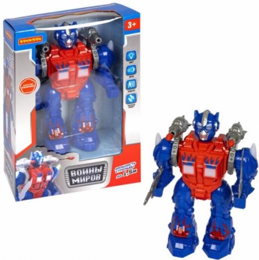 Великий воин миров от Bondibon имеет в своем арсенале мощные ракеты и стреляет ими очень далеко, до 1,5 метров. А как эффектно он это делает! Идет смело вперед, двигая руками, останавливается и поднимает пушки из-за спины. Каждое действие сопровождается разнообразными космическими звуками стрельбы и музыкой, которые в сочетании с мигающими подсветками превращают игру с роботом в сплошное удовольствие!