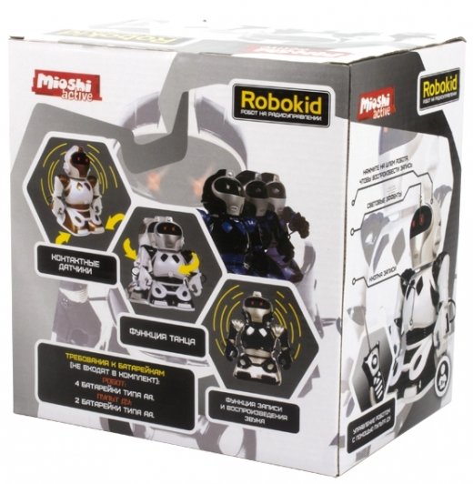 Радиоуправляемый робот Robokid TT338 умеет двигаться во всех направлениях, вращаться, записывать звук и танцевать под две разные музыки. Встроены звуковые и световые эффекты. На ногах робота расположены датчики, при нажатии на которые он издаёт различные звуки. Есть функция записи звука до 6 секунд и дальнейшего воспроизведения. Пульт ДУ имеет джойстик и 3 кнопки: