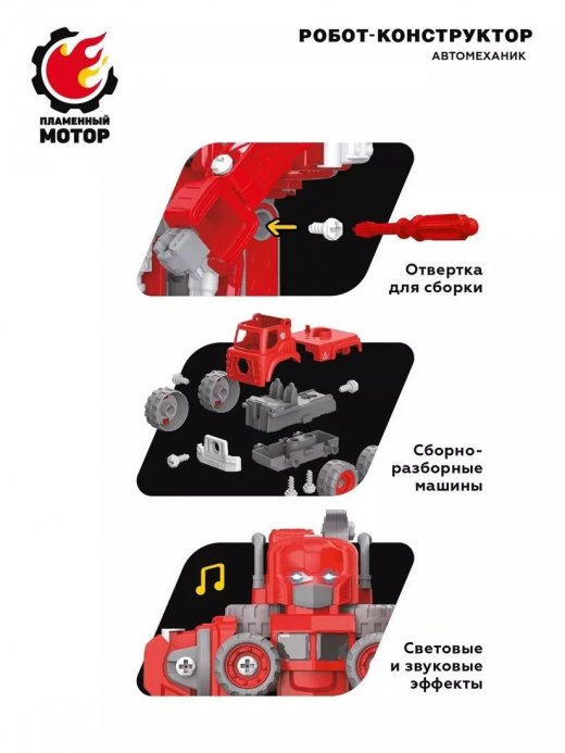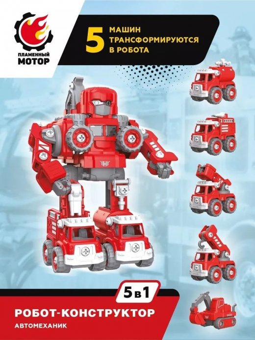 Робот-конструктор «Автомеханик» – это сразу 5 машин пожарной техники в одном наборе! Все машинки выполнены по принципу конструктора-скрутки: каждую из них можно собирать и разбирать при помощи входящей в комплект отвертки. А когда захочется чего-то еще более увлекательного, машины можно будет трансформировать в одного крутого робота со светозвуковыми эффектами. При нажатии на кнопку игрушка воспроизводит звуки пожарной сирены, сопровождаемые динамичным мерцанием подсветки.