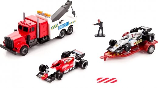 Набор машин Racing Team гоночный – это замечательный подарок для юного любителя техники и машин. В набор входят два гоночных автомобиля, одна машинка-тягач, две фигурки людей, платформа для эвакуации и дорожный знак. Корпуса машинок отлиты из металла, остальные части пластиковые. Мальчик, с помощью такого набора, сможет устроить настоящие гонки на скорость используя свои машинки в качестве участников заезда. На буксире установлен кран, при помощи которого ребенок сможет эвакуировать вышедшие из строя болиды, разместив их на специальной платформе.
