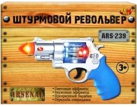 Штурмовой револьвер Arsenal может использоваться детьми с трех лет, ведь он абсолютно безопасен и при выстреле из него не вылетает пуль. Зато имеются реалистичные световые и звуковые эффекты, которые имитируют стрельбу очередями. Во время боя светится дуло, а также прозрачный барабан, поэтому в сумерках играть с револьвером Arsenal в войнушку – особенное удовольствие! Такая замечательная игрушка, несомненно, привлечет внимание ребенка и увлечет в игру надолго и с восторгом, а игровой процесс подарит ребенку массу положительных эмоций и зарядит его отличным настроением.