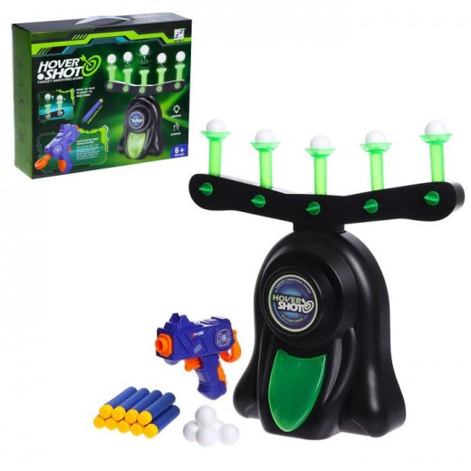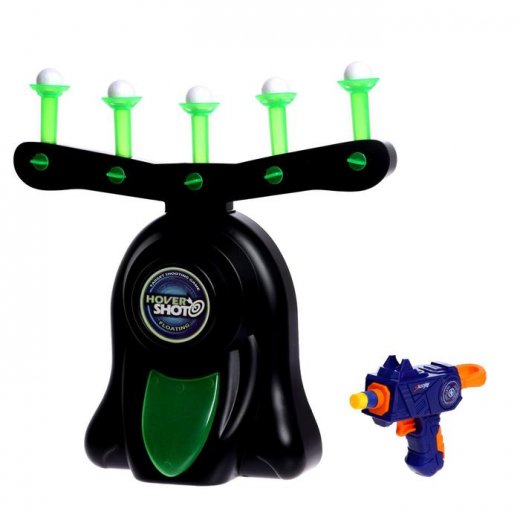 Игрушка состоит из базы, бластера, мишеней, пенных патронов и пенопластовых шариков.