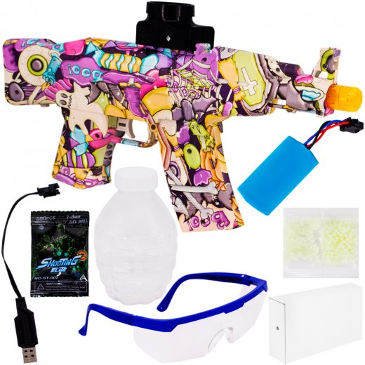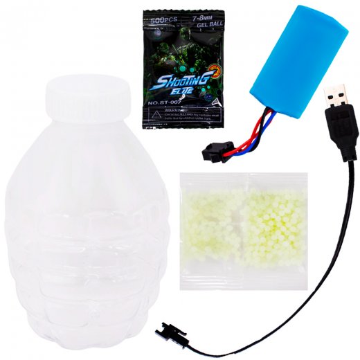 Комплектация: автомат - 1 шт, прицел - 1 шт, очки - 1 шт, аккумулятор - 1 шт, USB - кабель - 1 шт, емкость для хранения пуль - 1 шт, инструкция - 1 шт, пульки - 2 уп.
