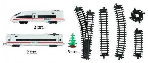 Набор включает в себя 20 закругленных и 8 прямых сегментов пути, 2 стрелки, перекресток, быстрый и маневренный локомотив, 3 пассажирских вагона и 3 елочки.