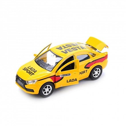 - Миниатюрная машинка в точности повторяет автомобиль марки Лада Веста Спорт, который представлен в ярком желтом цвете и дополнен декоративными наклейками.