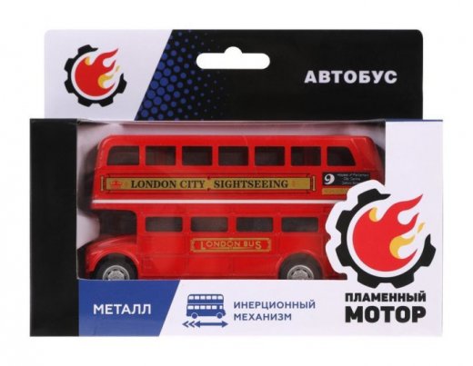 Уменьшенная модель лондонского двухэтажного автобуса отличается тщательной проработкой деталей. На первом этаже автобуса имеется миниатюрная кабина водителя, на обоих этажах расположены пассажирские сиденья. В игрушке есть инерционный механизм движения – pull back. Чтобы отправить машину в самостоятельное путешествие, нужно сперва откатить ее назад, на небольшое расстояние, а затем отпустить.