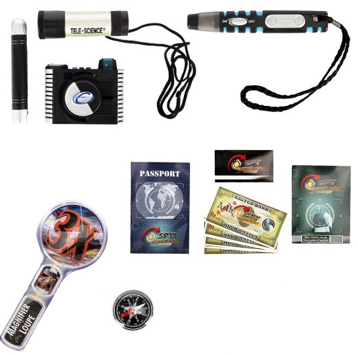 Состав набора: диктофон со световыми и звуковыми эффектами, шпионская ручка с невидящими чернилами, телескоп, фотоаппарат, компас и фонарик, блокнот, паспорт шпиона, три пластиковые карточки, 6 шпионских денежных банкнот, лупа.
