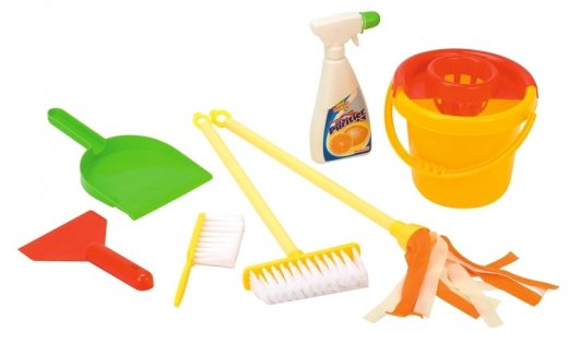 Состав набора: щетка, совок, выбивалка, ведро, насадка на ведро, швабра, упаковка игрушечного средства.