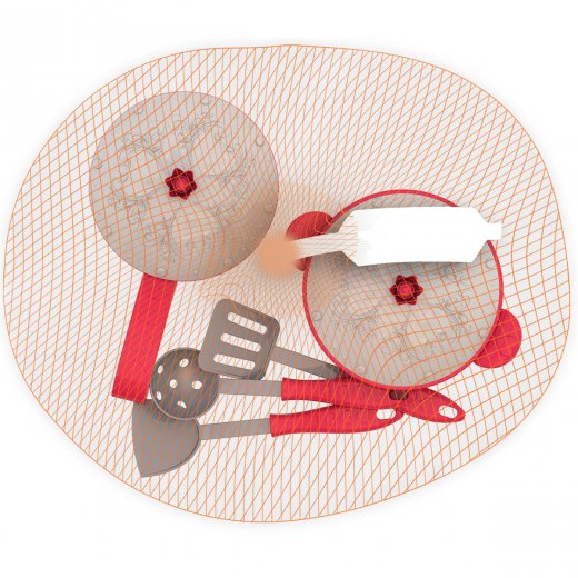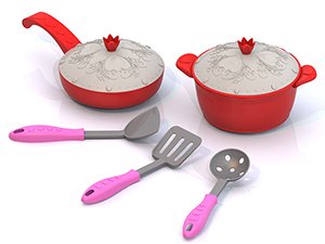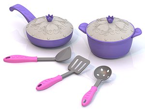 Состав набора: сковородка с крышкой (диаметр 11 см), кастрюля с крышкой (высотой 6 см, а диаметром 11 см), две лопатки (размер 16 см), шумовка (размер 16 см).