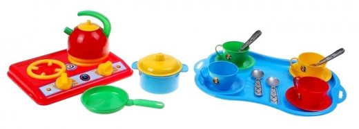 Состав набора: газовая плита, 4 блюдца, 4 ложки, 4 чашки, крышка, сковородка, кастрюля, чайник, поднос.
