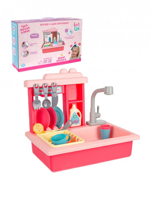 Продукты можно мыть в раковине с настоящей водой. У раковины два отделения - одно для мытья посуды и второе отделение для того, чтобы вода стекала с уже помытых тарелок, вилок, ложек и чашек. В теплой воде посуда меняет цвет.