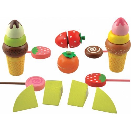 Из элементов, которые входят в данный набор, можно "приготовить" две порции мороженого в стаканчиках, а также красиво сервировать стол и угостить всех присутствующих леденцами на палочках, клубникой, апельсином и дыней. Кусочки фруктов и ягод, а также части мороженного соединяются между собой при помощи липучек, поэтому можно придумывать самые разные варианты блюд, например, украсить мороженое половинкой ягодки или фрукта, или же сделать сложный фруктово-ягодный "бутерброд" из кусочков дыни, клубники и апельсина.