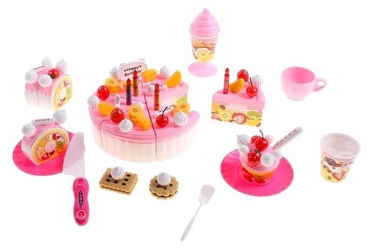 Состав набора: 12 предметов (торт из 6 кусочков, 2 блюдца, 2 печеньки, 1 мороженое, 1 кружка, 1 стакан, нож, ложка, рулет из 3 кусочков, пирожное).