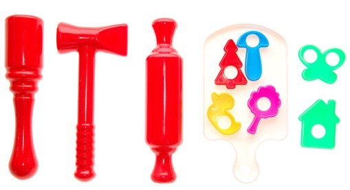 Состав набора: 1 набор (разделочная доска, толкушка, скалка, кухонный молоток, разноцветные формочки для печенья (домик, бабочка, утка, гриб, елка, береза)).