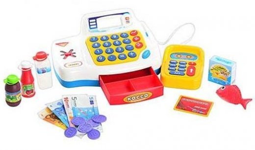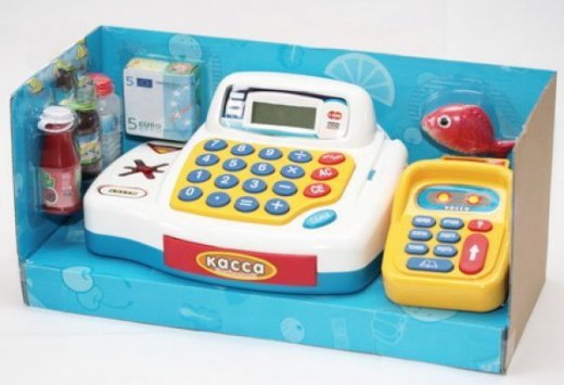 Кассовый аппарат Мой магазин – прекрасно подходит детям для ролевых игр. Игровой набор включает в себя большой кассовый аппарат, а также множество разнообразных аксессуаров для интересной игры. Здесь можно найти муляжные деньги, кредитную карточку и даже игрушечные продукты. Кассовый аппарат сможет засчитать товар через сканер (световой эффект), а калькулятор на нем позволит рассчитать сдачу. В кассовом ящике можно хранить деньги. Специальный терминал поможет покупателю расплатиться кредитной картой. Также касса имеет звуковые эффекты, что придает ей еще большую схожесть с настоящим терминалом.