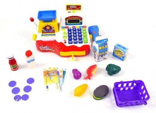 Состав набора: касса, деньги, товар, корзина, аксессуары.
