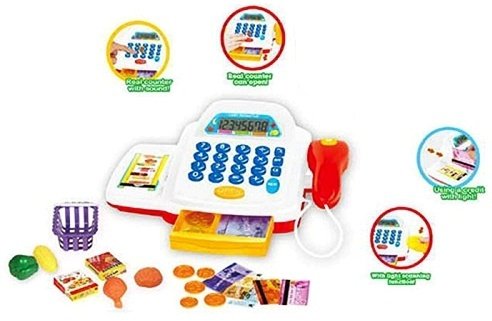 В качестве аксессуаров выступают купюры, монеты и даже пластиковые карточки, поэтому ребенок сможет принимать различные формы оплаты. Набор поможет ребенку подтянуть математику, ведь юному кассиру предстоит считать деньги и правильно выдавать сдачу.