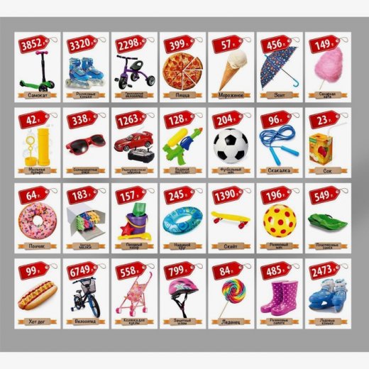 Разделите все деньги на 2 части таким образом, чтобы большая часть оказалась у ребёнка. Разложите на столе карточки товаров. В данной игре ребёнку предстоит выполнять функцию продавца: покупайте у него товары, давая сумму, превышающую стоимость товара, чтобы ребёнок выдавал вам сдачу.