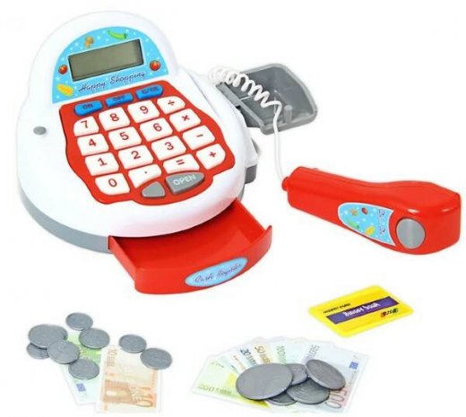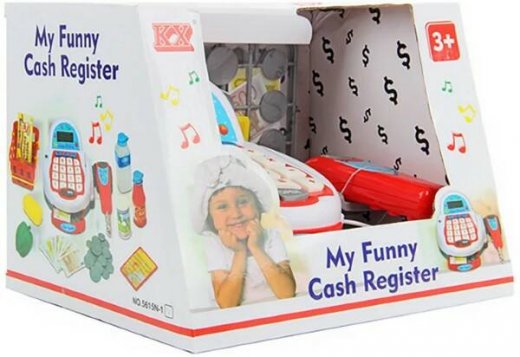 Игрушка My Funny Cash Register Касса — всё, что нужно для увлекательной ролевой игры в магазин. Здесь есть игрушечные деньги — монетки и купюры, фигурки продуктов, корзина для покупок, сканер для считывания цены, который крепится сбоку кассы, и реалистичный кассовый аппарат с большими удобными кнопками и выдвигающимся лотком. Игрушка с подсветкой издает звуковые сигналы.