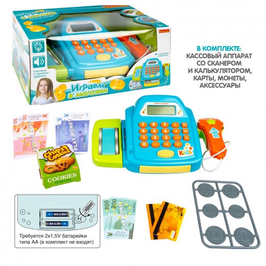 Играем в магазин – замечательный набор для сюжетно-ролевых игр от TM BONDIBON. В наборе кассовый аппарат, сканер, калькулятор и различные аксессуары - всё, как в настоящем супермаркете! Во время игры можно считывать штрих-код с помощью сканера, посчитать сумму покупки с помощью настоящего калькулятора, платить за покупки пластиковой картой или деньгами, получать за покупки настоящий чек, двигать транспортную ленту! Нажатием кнопки открывается отсек для денег. Работает от батареек (в комплект не входят).