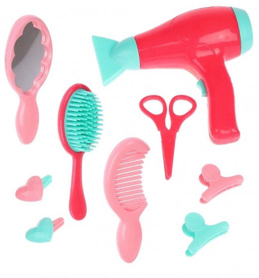 Предметы в комплекте: - плойка (14х2х2 см); - расчёска (14х5х2 см); - электрический фен (16х6х14 см); - 2 бигуди (5х2,5х2,5 см); - безопасные ножницы (11х6х0,5 см); - безопасное зеркальце (11х1х10 см); - 2 заколки клик-клак (4х2х1 см); - 2 заколки-крабика (5х3х1 см). Размеры игрушек в скобочках указаны в формате (Длина х Ширина х Высота).