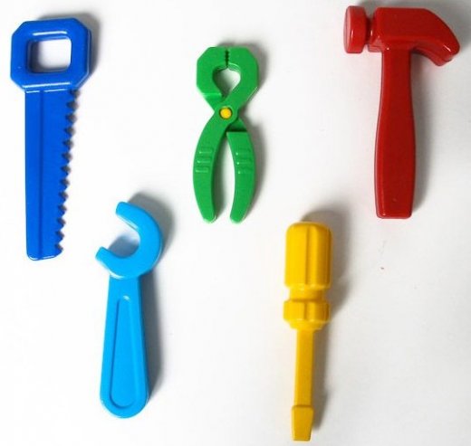 Состав набора: плоскогубцы, пила, молоток, гаечный ключ, отвертки.