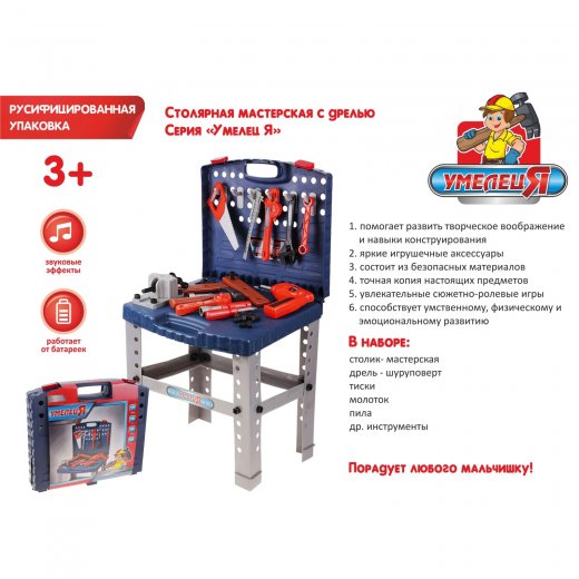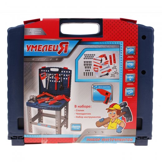 Игровой набор инструментов "Умелец Я" – это отличный комплект для юного мастера. В наборе компактно упакованы 70 предметов, среди которых молоток, дрель-шуруповерт, тиски, пила и другие принадлежности. Все это удобно размещено в пластиковом чемодане, который может легко превратиться в рабочий столик. Предметы выполнены из яркого и прочного пластика, они являются точными копиями настоящих инструментов. Кроме этого, игровой набор может порадовать некоторыми звуковыми эффектами, поэтому игра с ним не будет скучной.