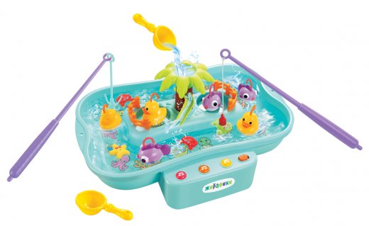 Развивающая игрушка "Рыбалка" от ТМ "Жирафики" предлагает ребенку отправиться в увлекательное приключение! В миниатюрном бассейне в настоящей водой водятся забавные крабики, морские звезды, рыбки и уточки. Эти милые обитатели водоема плавают по кругу за счет специального моторчика, который создает в воде искусственное течение. На удочку с крючком можно поймать рыбок и уточек, а на удочку с магнитом - мелких рыбешек и звездочек. Если зачерпнуть специальным ковшиком воду из бассейна и налить ее на пальму, стоящую на островке по центру бассейна, вода вытечет по желобкам обратно в водоем.