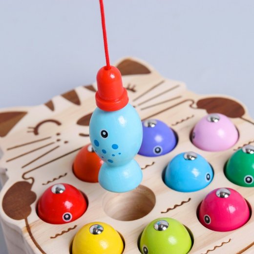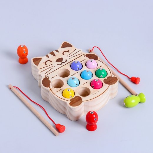 Развивающий набор рыбалка "Рыбки и котик" - это увлекательная игра с удочкой на магнитах. В комплекте деревянный пруд с отверстиями в форме котика, в которых прячутся 10 разноцветных рыбок с магнитными головками и 2 удочки, тоже с магнитным наконечником. Задача простая: с помощью удочки поймать всех рыбок.
