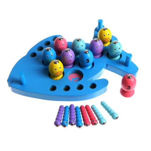 Поймать яркую добычу не так легко, как кажется! Кроха должен продемонстрировать навыки концентрации внимания и хорошую координацию движений, чтобы совместить удочку и рыбку или червячка.