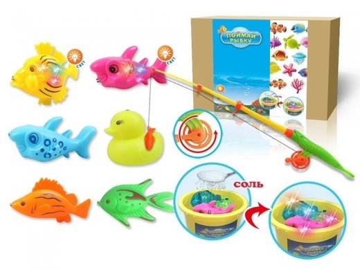 В комплект входят удочка и 5 рыбок и уточка.