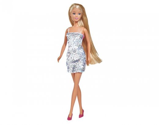 В этот раз светловолосая красавица Штеффи станет главным гвоздем вечерники, а все благодаря ее необычному платью с блестящими пайетками. Эти декоративные аксессуары на наряде могут менять свой оттенок, если владелица куколки проведёт по ним рукой в противоположном направлении.