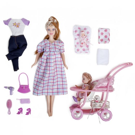 Наверное, все девочки в детстве играют в дочки-матери. А играть с куклами этого набора намного интереснее. Здесь есть две куклы, коляска, в которой мама прогуливает свою дочку, маленькая собачка - любимый питомец - и небольшой шкаф, в котором хранятся вещи (одежда и обувь, аксессуары, фен и расчёска).