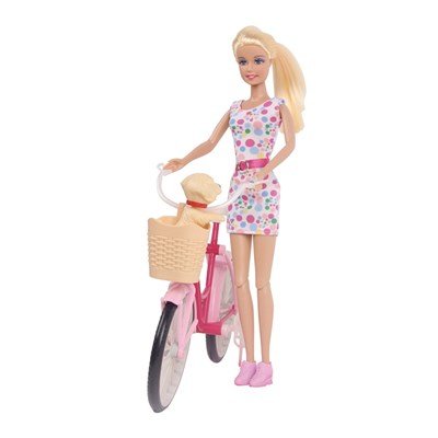 Кукла на велосипеде станет приятным и запоминающимся подарком для маленькой принцессы. Куколка, одетая в стильное платье с поясом и розовые туфельки. Ее всегда сопровождает любимый питомец — маленькая собачка. С куклой девочка может придумывать свои истории для игр. У куклы подвижные ноги, мягкие волосы, которые можно расчесать и заплести. Ручки куколки можно двигать, а ее наряд при желании можно сменить на любой другой, соответствующий стандартному размеру.