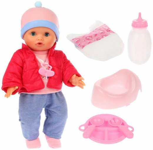 В состав набора включены следующие аксессуары: бутылочка, горшок, подгузник, соска-пустышка, тарелочка, ложка и вилка. Высота пупса составляет 30 см. Изделие изготовлено из ПВХ и пластмассы с элементами из текстильных материалов.