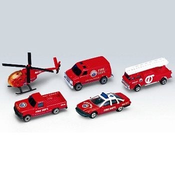В набор входит 4 различных автомобилей: пикап, грузовик, автомобиль с лестницей, машина с сиреной и вертолет пожарной службы.