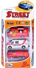 Игровой набор Street будет по душе каждому мальчику. В комплекте можно найти 3 вида машинок, разной специализации. Игрушки выполнены из пластиковых деталей. Благодаря набору ребенок может играть в сюжетно-ролевые игры, а также проводить спасательные операции. Машинки хорошо детализированы: у одной из пожарных есть лестница на крыше, а другая может выступать в качестве водоснабжения для тушения.