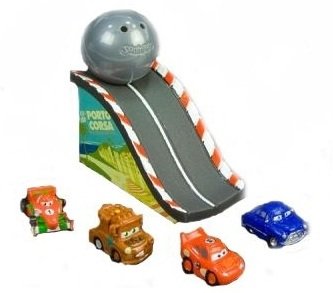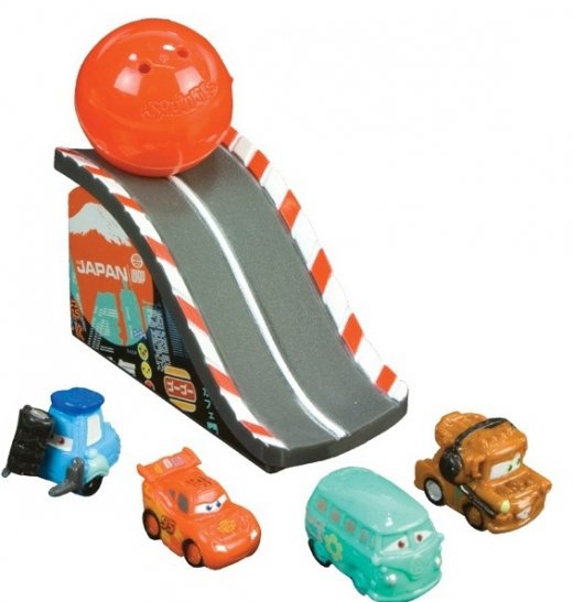 В нем есть 4 фигурки Squinkies, выполненные в виде анимационных персонажей: гонщик Молния Маккуин, тягач Мэтр, микроавтобус Филмор и шиномонтажник Гвидо. Также он комплектуется эстакадой, стилизованной под трассу в Японии. По ней резво скатываются фигурки, упакованные в круглые капсулы. Ассортимент включает множество различных персонажей со своей историей, которых можно коллекционировать сериями.