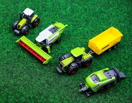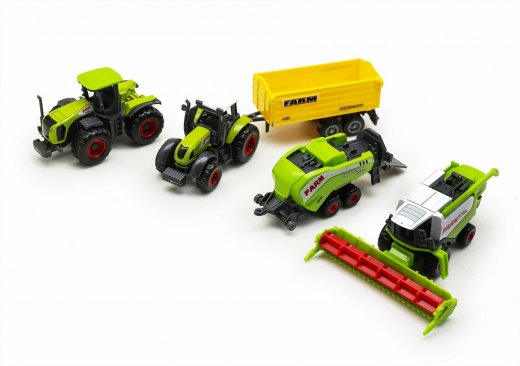 В наборе три вида тракторов и два прицепа. Размер техники: 7-9 см