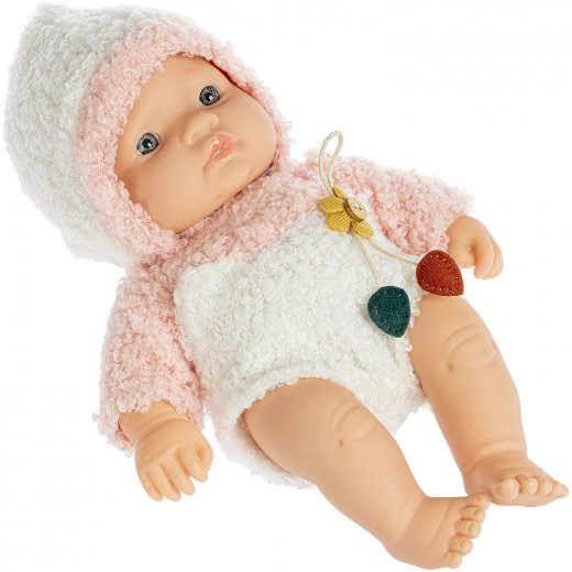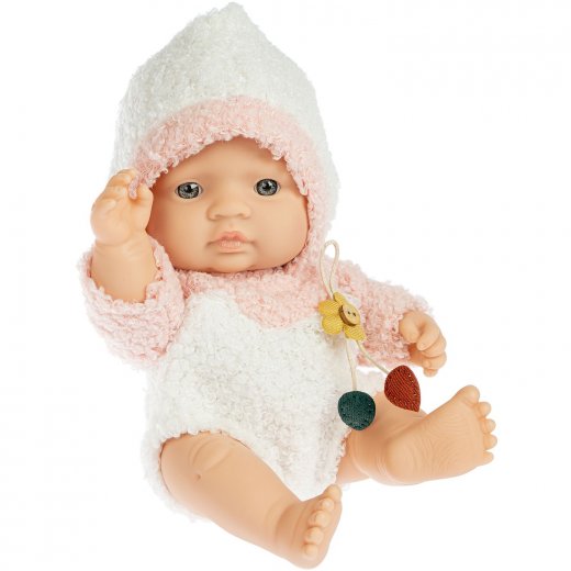 Длина куклы составляет 21 см. Тканевый костюмчик нежного бело-розового цвета. Пупс изготовлен из качественных и безопасных материалов, приятных на ощупь, проработаны мелкие детали: складочки на коже, ноготочки, чтобы пупс выглядел как настоящий ребенок.