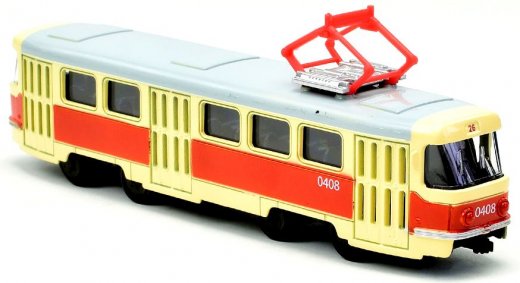 Металлический инерционный трамвай белый с красной полосой сделан по подобию настоящего трамвайного вагона, масштабом - 1:87. Такие трамваи выпускались с 1960 года в Праге и поставлялись в Центральную и Восточную Европу, включая и СССР. Трамвай выглядит как настоящий, только в уменьшенном виде. Корпус трамвая выполнен из металла, а дно, колеса и штанга - из пластика. У него инерционный механизм, если отвести вагончик назад, а потом отпустить, он поедет вперед сам. Такая машина приведет любого мальчишку в восторг, а если собрать остальные трамваи из этой серии, то получится целый автопарк трамвайных вагонов разных цветов.