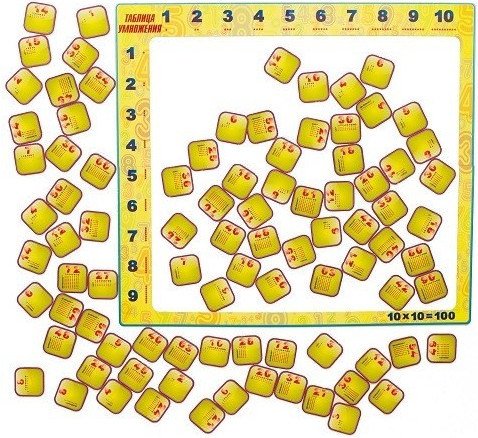 Для занятий подходит магнитная доска или дверца холодильника. Перед началом игры состыкуйте 2 части рамки в большой квадрат. Задача маленького ученика – правильно вписать все элементы пазла внутрь свободного пространства. При этом необходимо соблюдать закон умножения чисел.