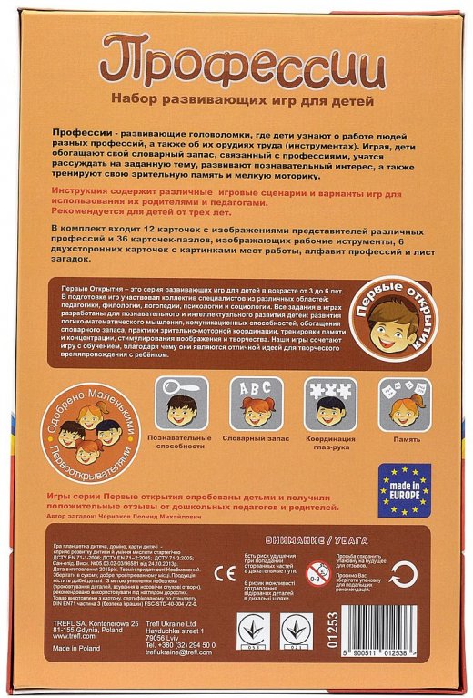 Набор развивающих игр "Профессии 13 вариантов" польского производителя Trefl предназначена для обучения малышей в игровой форме. С этой игрой любознательный малыш узнает об особенностях различных профессий - кто и где работает, какие использует инструменты. Карточки с яркими изображениями заинтересуют кроху, а увлекательные загадки вовлекут его в познавательную игру. Играя, дети обогащают словарный запас, связанный с профессиями, практикуют способность выражать себя по определенной теме, стимулировать когнитивное любопытство и развивать визуальную память и ручные навыки.