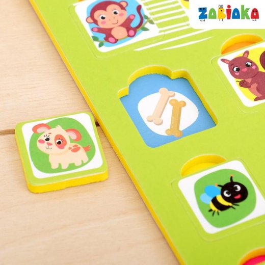 Перед малышом стоит задача: вытащить все вкладыши, познакомиться с животными и узнать, чем они питаются. Такая игра потренирует память ребёнка.