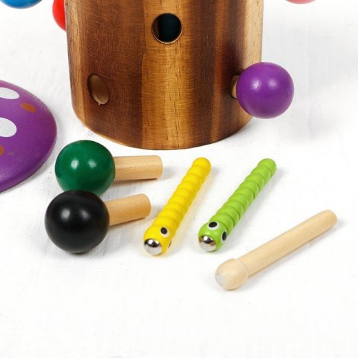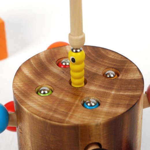 Развивающая игра "Рыбалка" - веселая игра для малышей от 1,5 лет. В комплекте деревянный пенек, в нем 5 дырочек, в которых прячутся 5 разноцветных червячков с магнитными головками и "волшебная" палочка, тоже с магнитным наконечником. Задача простая: с помощью магнитной палочки нужно поймать всех червячков, а потом посадить их обратно в норки. Это не так просто, как кажется, и требует большой сосредоточенности и меткости.
