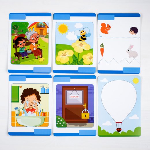 В наборе есть карточки, в которых прописано, что конкретно нужно делать. В основном это стишки на развитие мелкой моторики и правильность произношения звуков. В наборе содержатся карточки для игры с наклейками. Чтобы ещё больше развить моторику малыша, в комплекте есть задание на вырезание. Кроха должен сделать это сам, но под вашим присмотром.