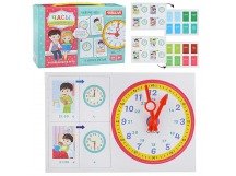 В составе игры: часы со стрелками, 14 карточек часов и 14 карточек действий.