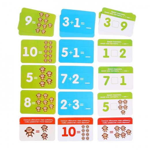 3. Выполняйте задания на карточках. Расскажите крохе о понятиях «меньше», «больше» и «равно». Подкрепите его знания заданиями с карточек.