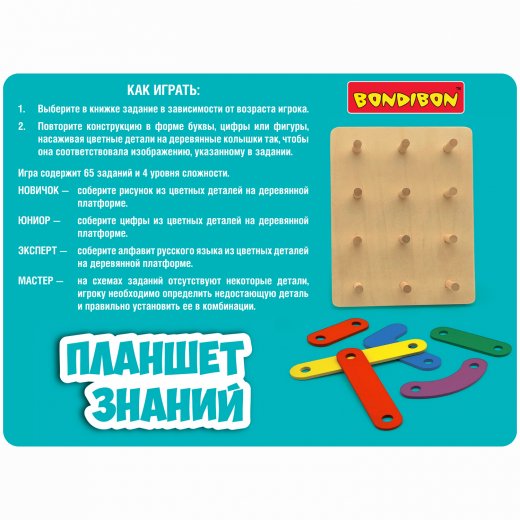 В комплект входят: деревянные детали, подставка, книжка с заданиями.